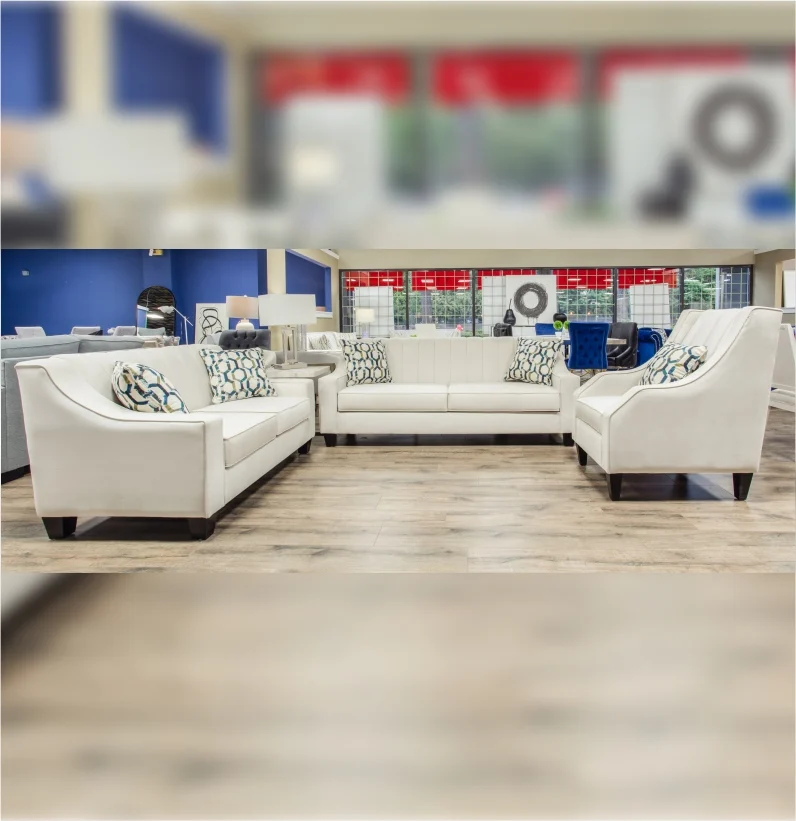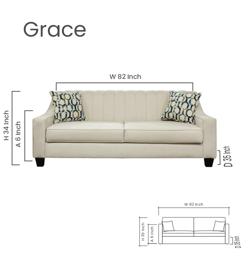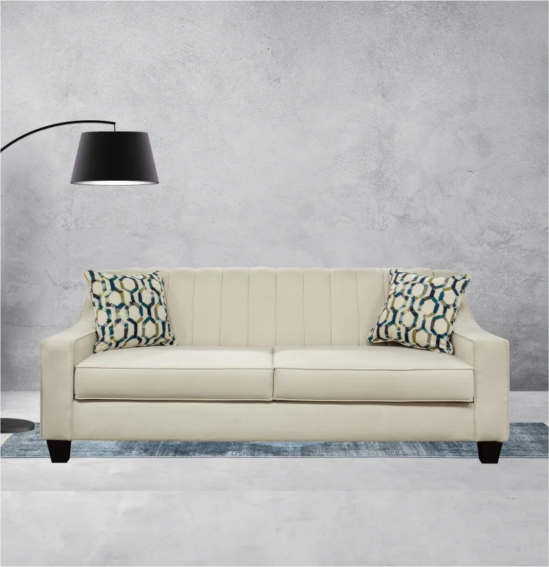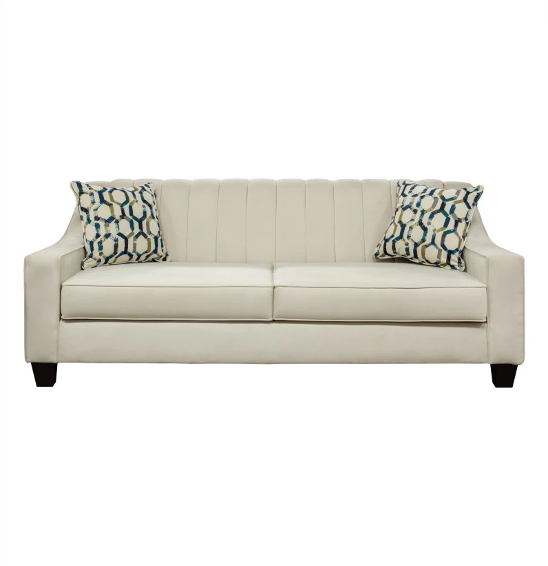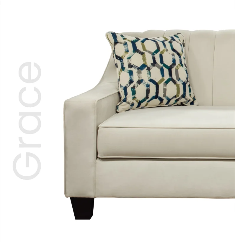The Grace sofa features a sleek, channel-tufted back with a timeless, elegant design. Its soft, oyster-colored upholstery offers a sophisticated touch of comfort, and the blue geometric toss pillows add a touch of vibrancy.