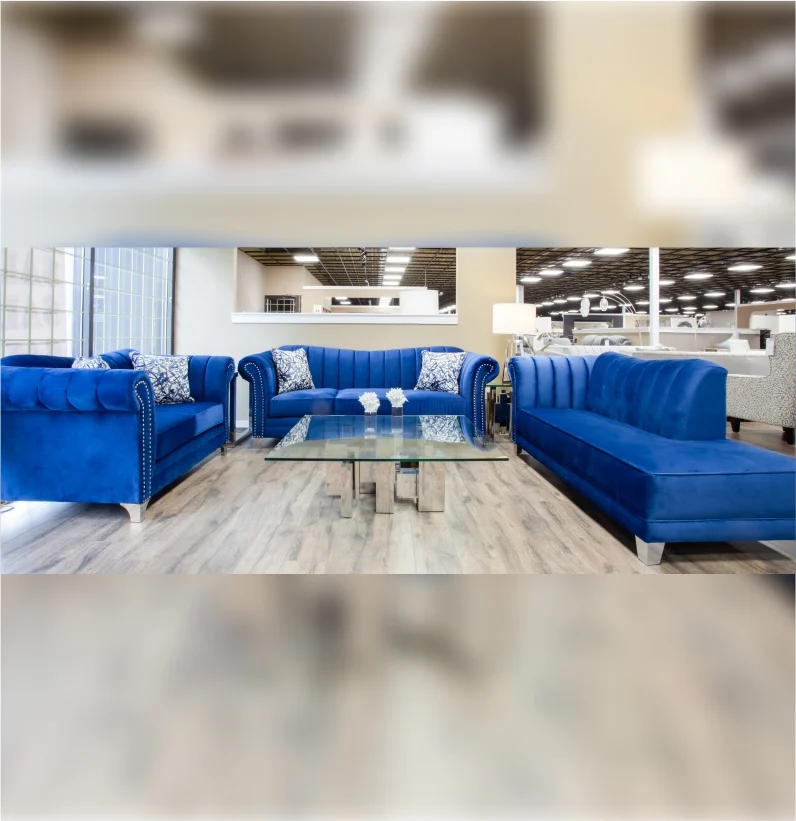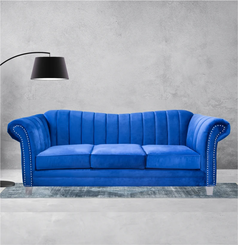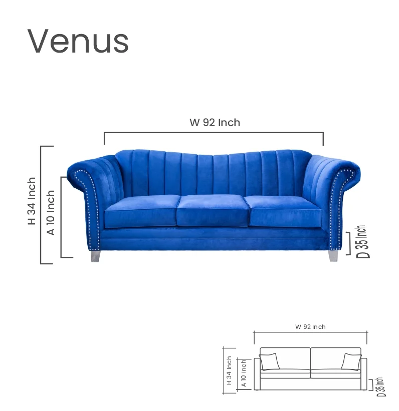 The Venus sofa is a statement piece with its dramatic curves and rich, midnight blue velvet upholstery adds a touch of glam. The sleek, silver legs give it a modern feel. Pair it with the Kiykat Blue toss pillows for a touch of vibrant color.